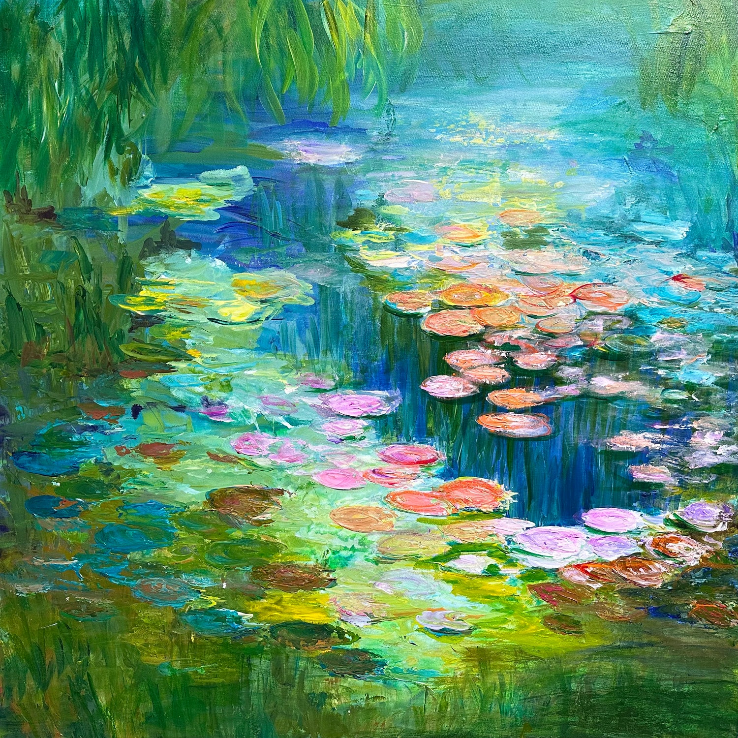 Impressionist genius of Claude Monet with Maria-Victoria's stunning water lily oil paintings. Inspired by Monet's iconic series of water lilies at Giverny, Maria-Victoria's interpretations breathe new life into this timeless subject matter. With a delicate balance of light, color, and texture, she captures the ethereal beauty of water lilies in full bloom, inviting viewers to lose themselves in the tranquility of these serene aquatic scenes. Whether displayed in a living room, bedroom, or hallway, Maria-Victoria's water lily paintings add a touch of informal elegance to any space.