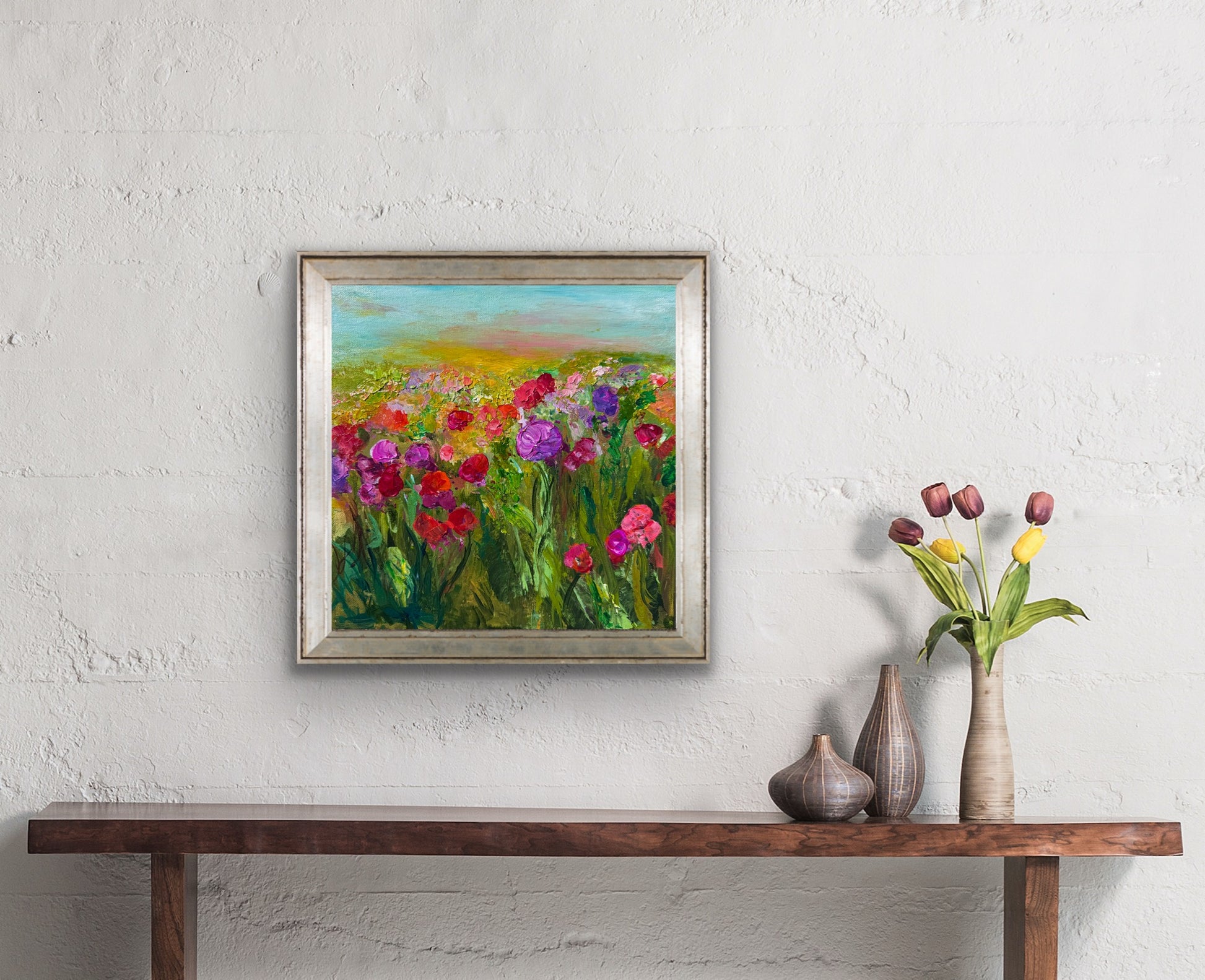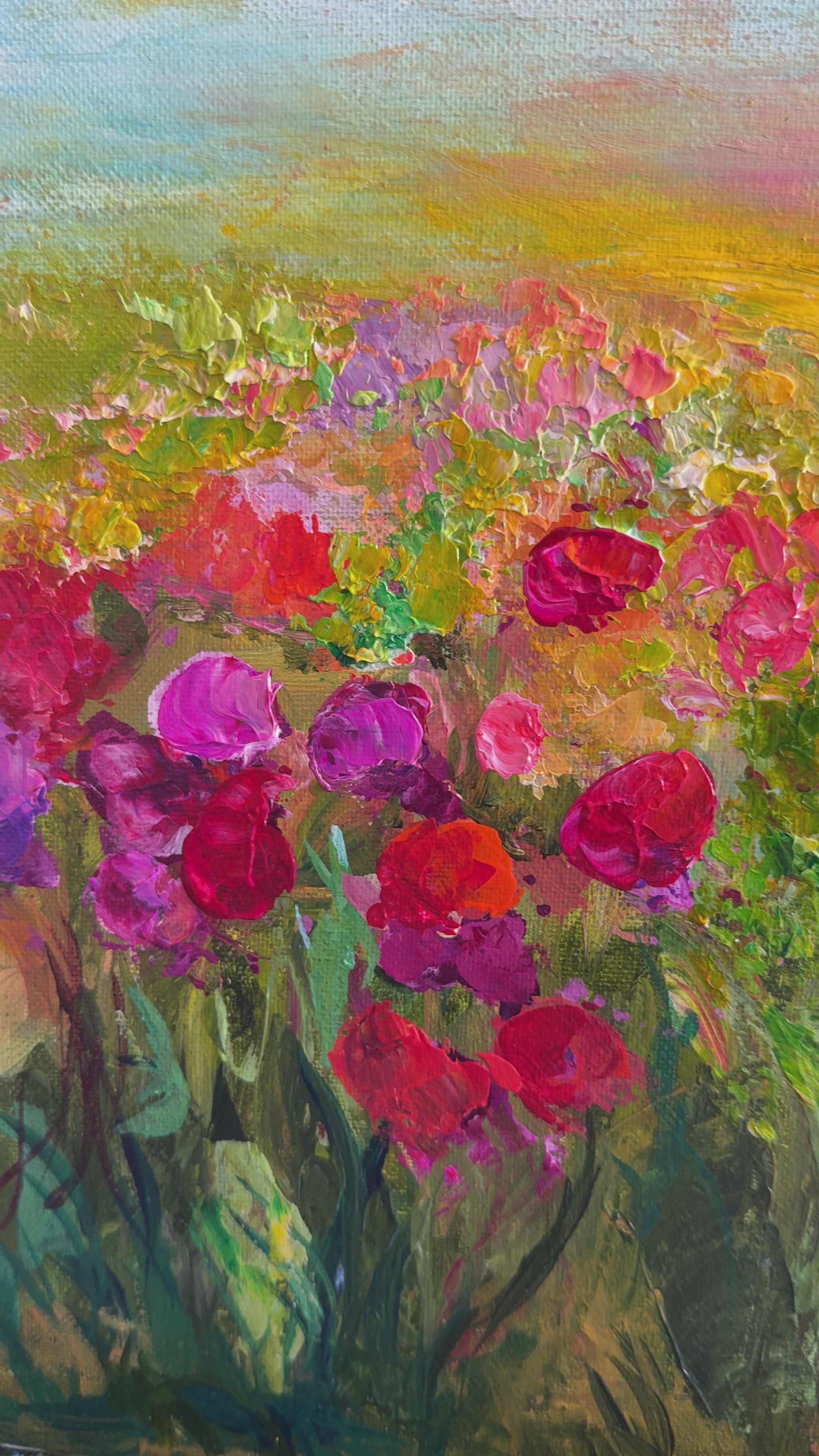 Capture the beauty of fleeting flowers with this stunning painting. Vibrant warm purple and red orange tones are expertly blended against a moody sky, creating a mesmerizing piece of art. Add a touch of nature's transience to your home with this unique painting.