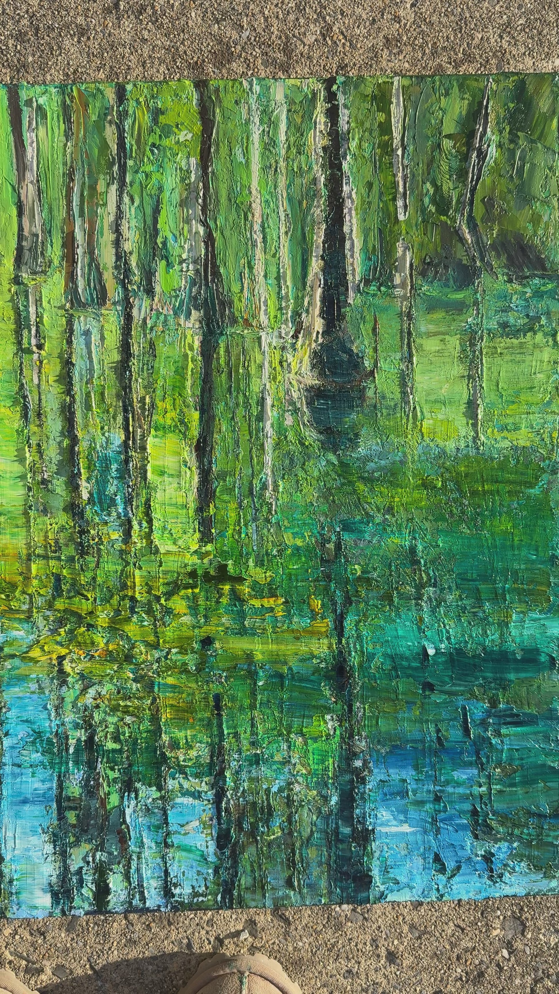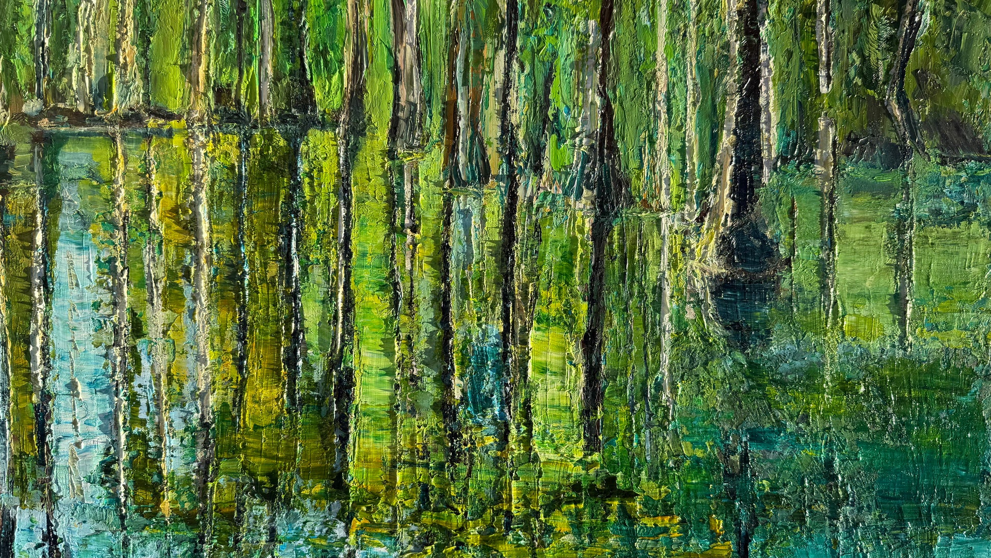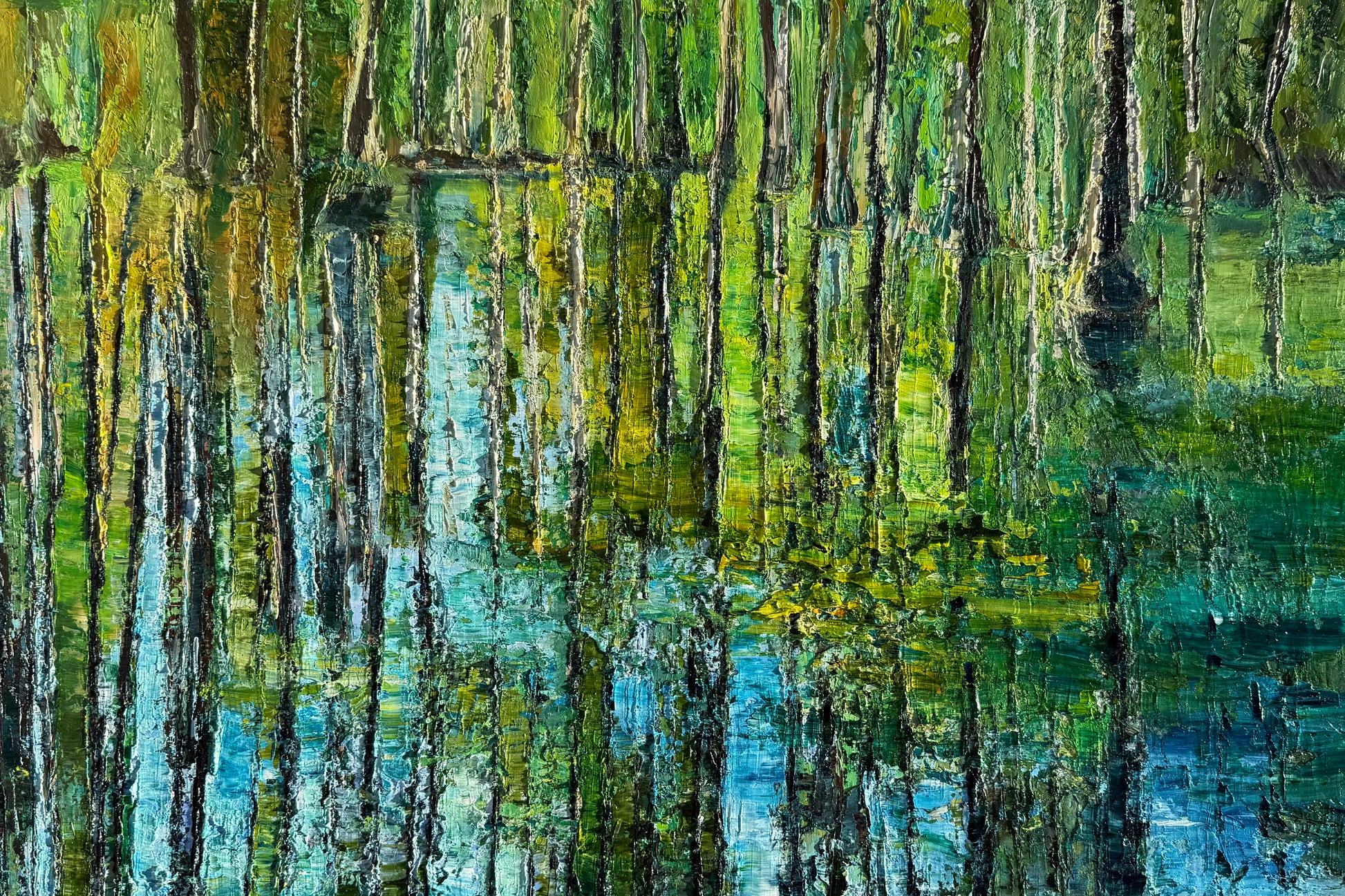 Bring a splash of serene charm to your space with this playful horizontal oil painting, featuring graceful cypress trees mirrored in tranquil waters. Painted in soothing greens and blues, it captures a peaceful garden scene that invites calm and whimsy into any room. Perfect as a decorative centerpiece, this 24" x 36" artwork adds a fresh, lively touch to your walls.