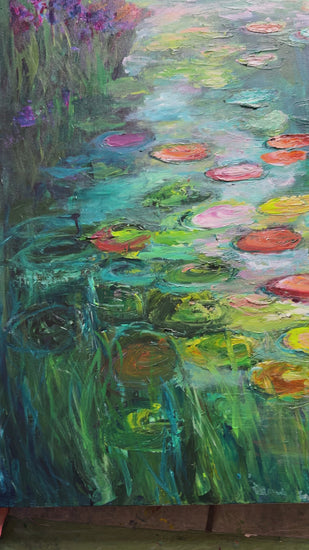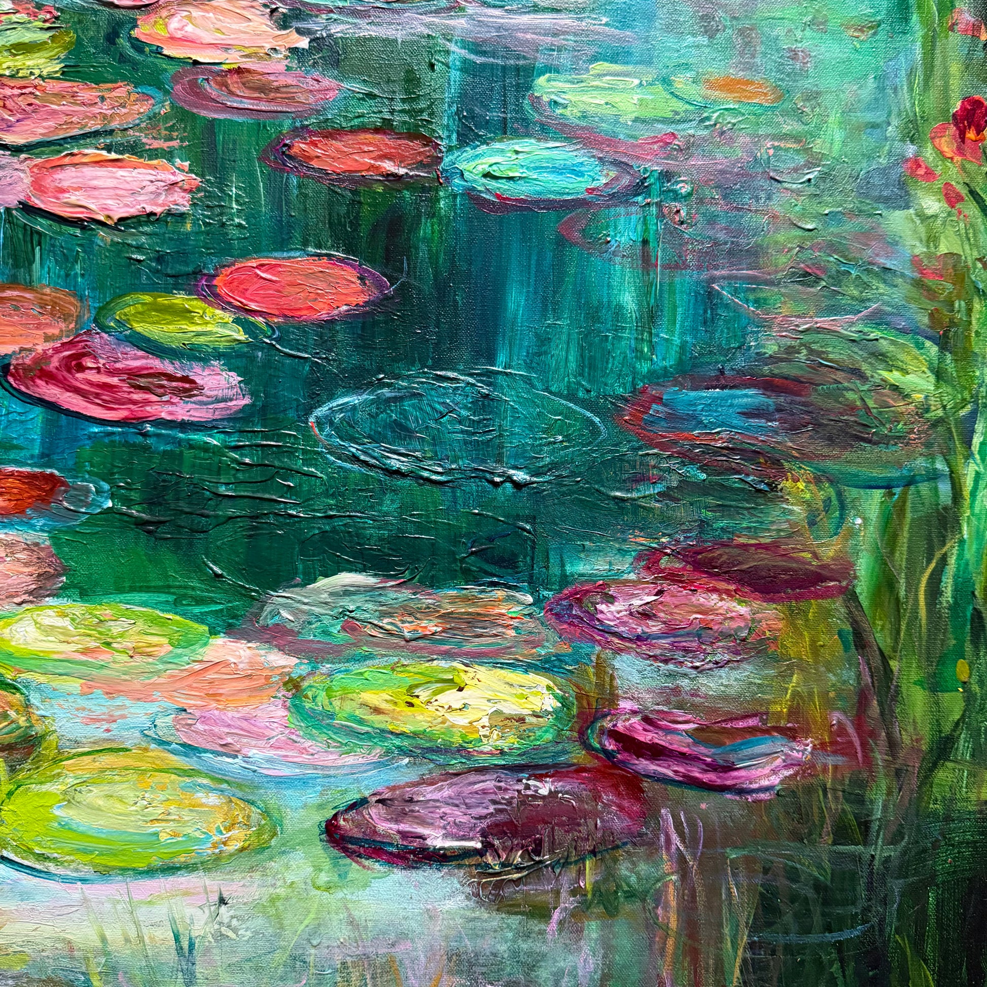 Dive into a whimsical escape with this vibrant 48" x 48" acrylic painting of a water lily garden. Turquoise waters shimmer beneath red and magenta lily pads, surrounded by blooming flowers that invite you to a peaceful, enchanting refuge. Perfect for adding a playful splash of color and serenity to any space.